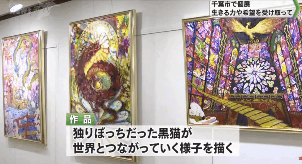 「くろねこと いっしょに せかいの たびへ-心の居場所を探して-」展が、千葉テレビ様の取材を受けて、当日の18時と21:30のニュースで紹介されました。