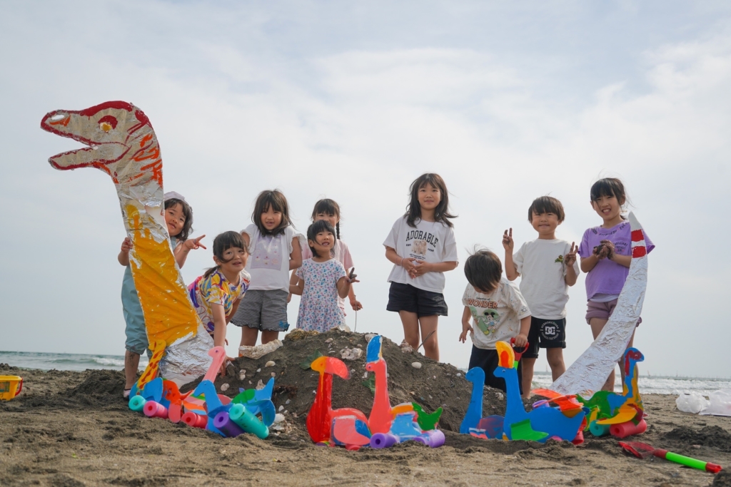 一般的な絵画教室と異なるのが、あらゆるアート ー例えば、巨大な恐竜や新幹線を作ったり、プロジェクションマッピングなどデジタルアートに挑戦したり、野外で落ち葉でファッションショーをすることもあれば、海にみんなで行って泳ぐモササウルスを制作したり ー 準備に毎週かなりの時間がかかり、材料代もかかります。